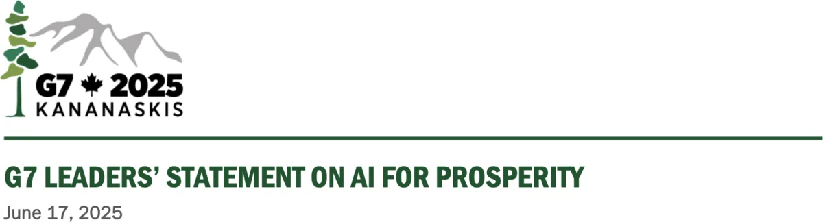 From the Council of the European Union website, we report that at the 2025 G7 Leaders’ Summit held in Kananaskis, the G7 leaders adopted, among other declarations, the statement entitled “G7 LEADERS’ STATEMENT ON AI FOR PROSPERITY”.